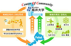 分野研究・支援・公的機関 概要「地域を志向して人を育み、地域を活かす福井の知の拠点づくり」と題したテーマで行っているCOC事業について紹介します。 COC事業では、「地域の課題解決による再生・活性化」として人材育成や産業振興、地域医療の向上などを目指し、事業に取り組んでいます。また、これらの課題の解決に取り組んでくれる地域志向の人材を育成するためのカリキュラム編成も行っています。 |
