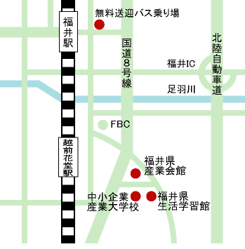 ●JR福井駅東口より会場まで無料送迎バスを運行。・・・27日28日の両日 9時より 毎時00分・30分発 ○JR福井駅前から・・・市内バス10番(羽水高校線) ○タクシー・・・JR福井駅前から約10分 ○北陸自動車道・・・福井インターから車で約10分 |