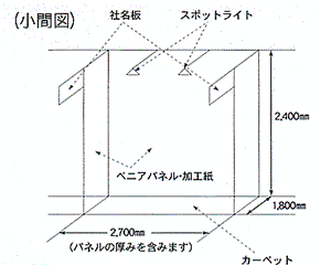 間口2,700mm×奥行き1,800mm×高さ2,400mm (スポットライト2灯、社名板2枚、パネルは加工紙仕上げ) ![]() (2)小間の配置 会場全体の基本構成、小間の配置は、出展者数、出展小間数、出店物等の内容を考慮して主催者にて決定し、改めてご連絡いたします。 |